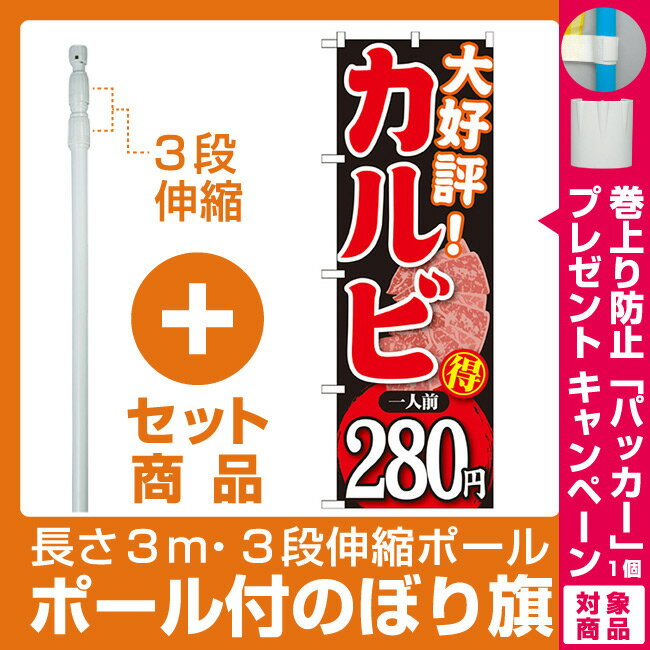 【セット商品】3m・3段伸縮のぼりポール(竿)付 のぼり旗 大好評カルビ 内容:一人前280円 (SNB-227)(焼肉・韓国料理)